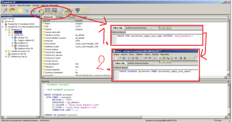 (při nové instalaci bude pgAdmin vypadat pravděpodobně jinak – stačí rozbalit menu Servers -> PostgreSQL -> Databases -> postgres -> pravé tlačítko myši -> Query tool -> vytvořit uživatele -> vytvořit databázi)